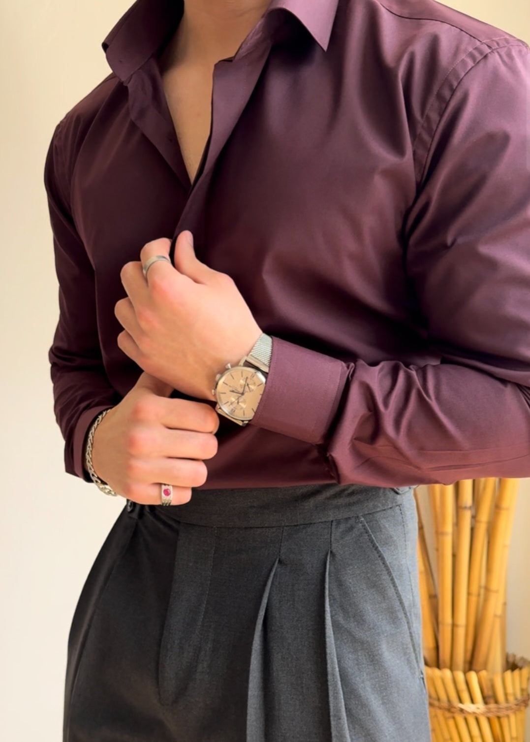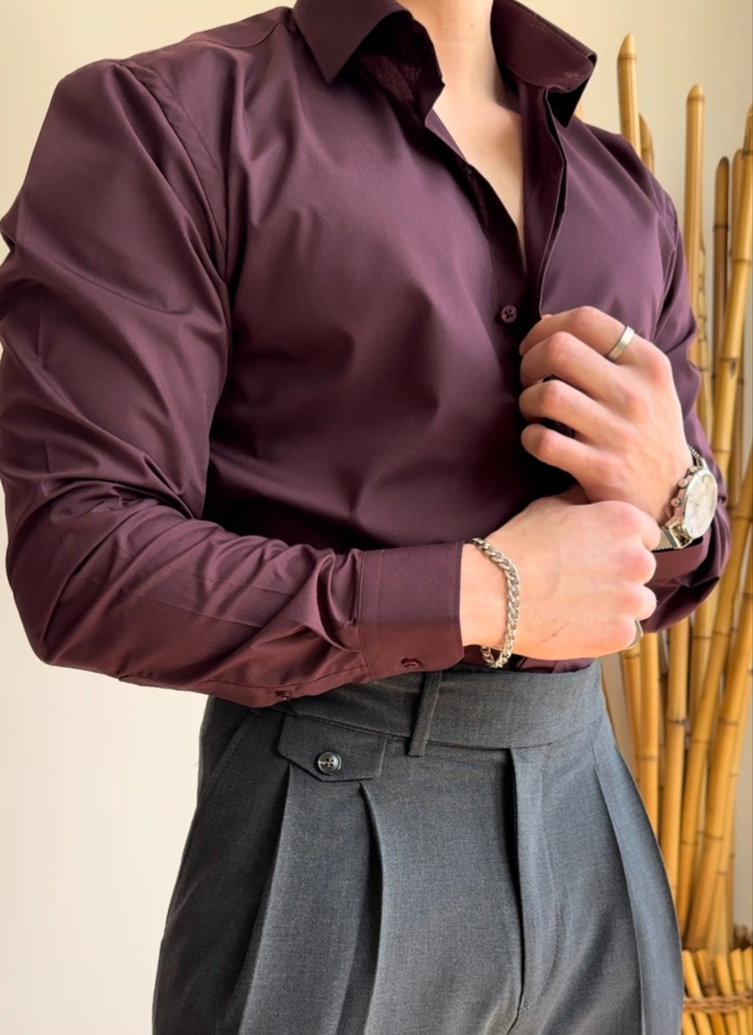 Designed with a sculpted spread collar and elegant, hand-finished cuffs, the Vega Maroon Signature Shirt merges timeless style with contemporary sensibility. Its slim, structured fit shapes the silhouette while allowing freedom of movement, perfectly complementing both formal and semi-formal occasions. The rich maroon fabric catches the light with a subtle sheen, lending an air of distinction whether buttoned up for classic refinement or worn with an open collar for relaxed elegance