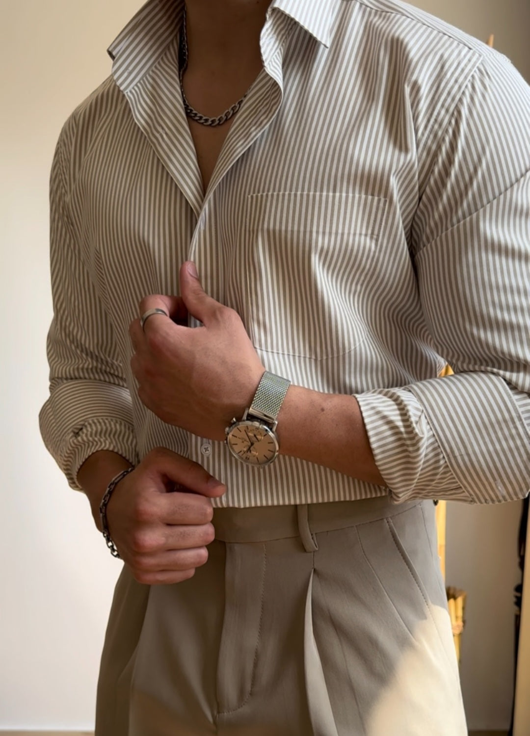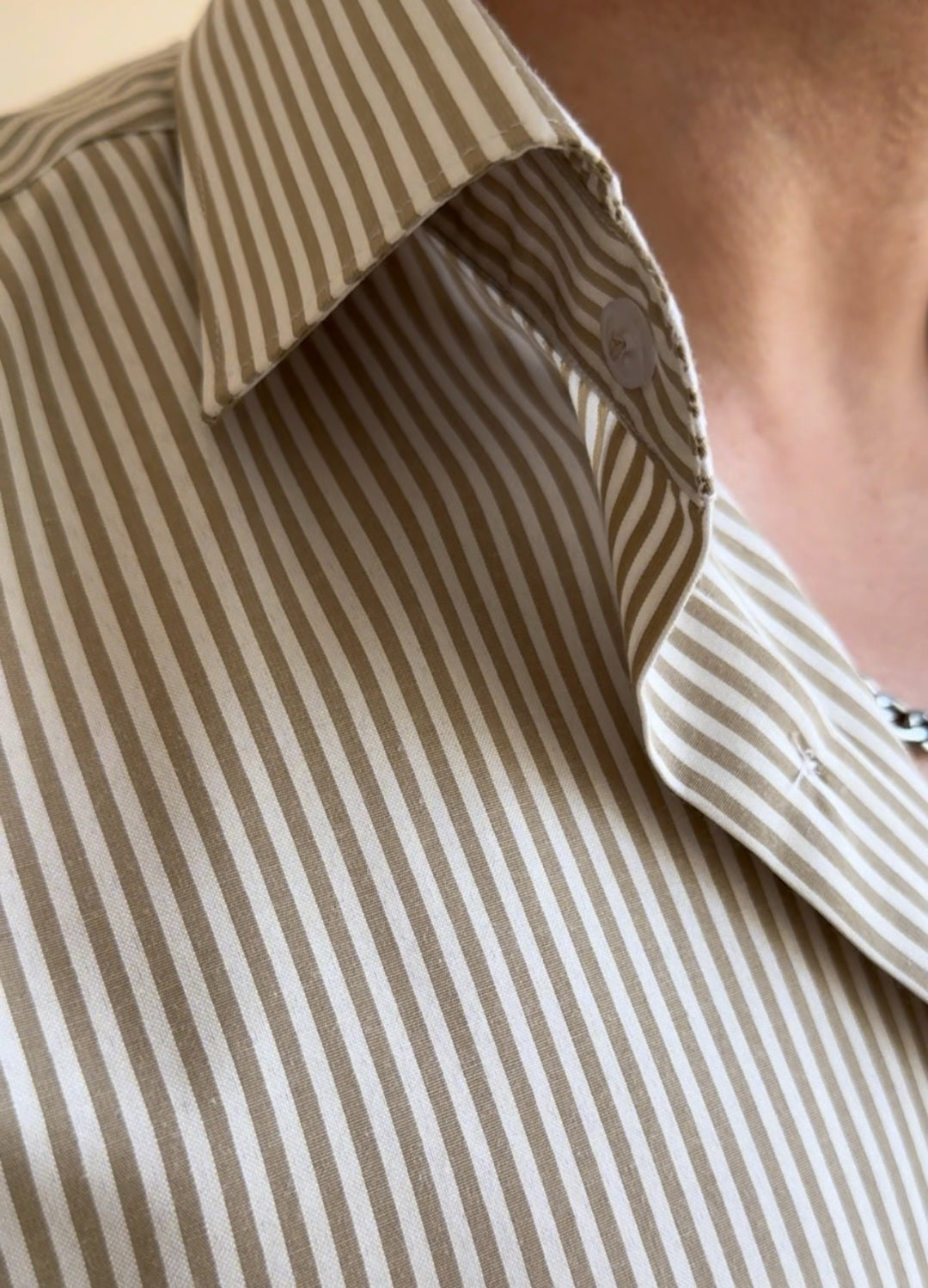 Tailored to perfection from premium, fine-cotton fabric, the Vega Modern Stripe Shirt features a vertical beige-and-white stripe motif, effortlessly balancing tradition and modernity. The stripes are meticulously woven for a smooth, breathable feel against the skin, ensuring lasting comfort throughout the day. Its expertly engineered Italian collar provides a crisp frame to the face, while the reinforced pearl buttons and precision double-stitch seams offer durability and discreet luxury.