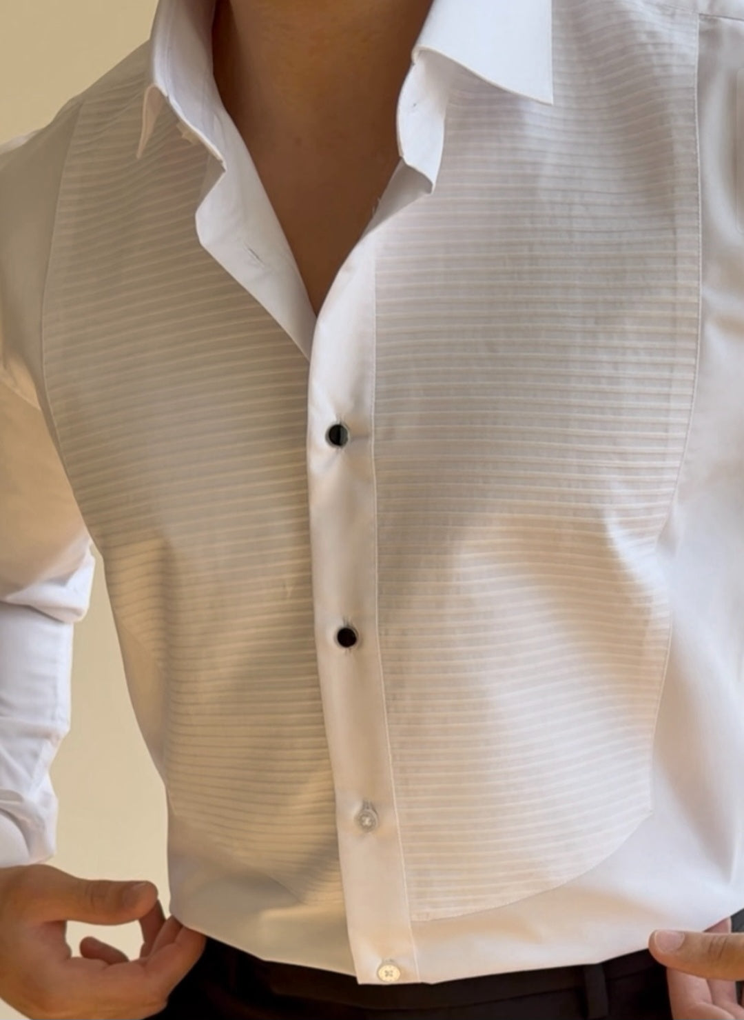 Tailoring matters: the slim yet sculpted fit molds to the body for a polished silhouette while allowing comfort and freedom of movement throughout the evening. French cuffs are finished with bespoke cufflinks, a nod to luxuryโs finest details and a mark of true craftsmanship. Each button is reinforced and discreetly placed, ensuring durability and aesthetic coherence.
